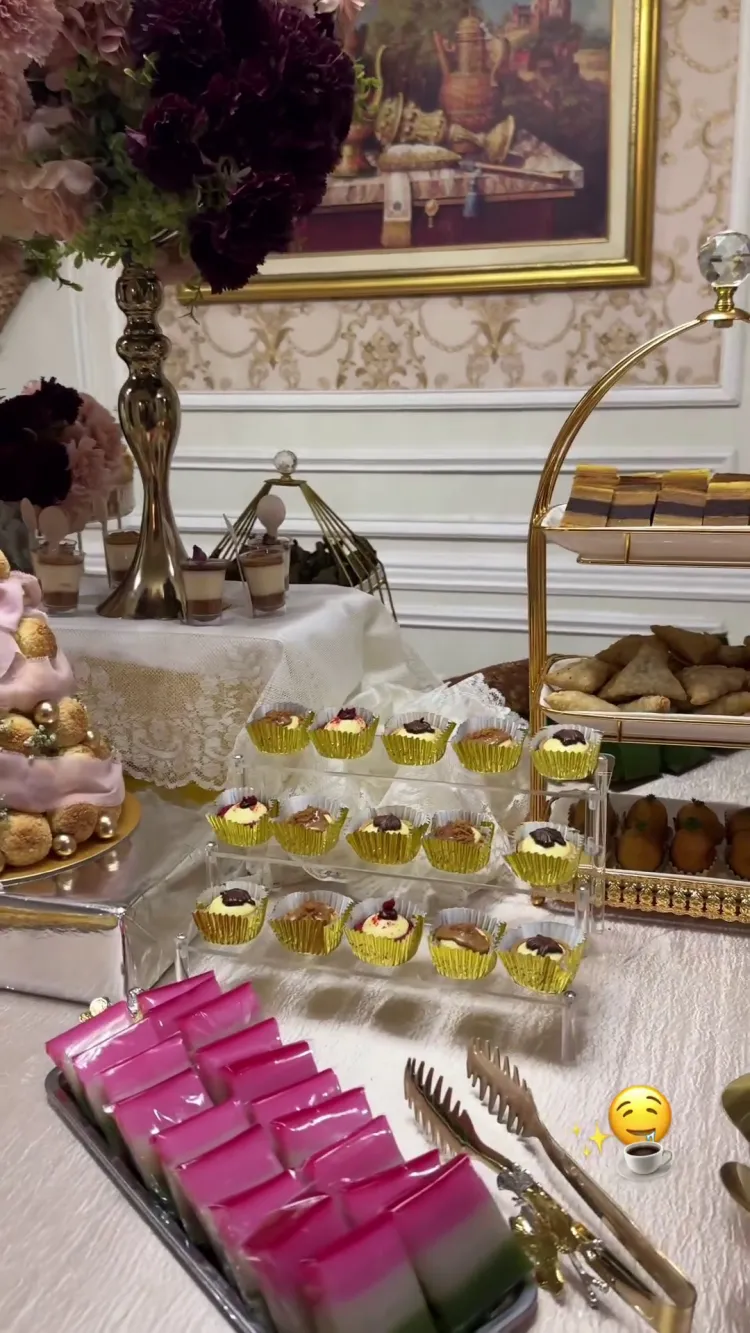 Deretan hidangan tersebut ditata dengan rapi di atas meja. Dekorasi meja pun dihias dengan buket bunga, sehingga menambah kesan mewah. Tak hanya itu, beberapa kue atau makanan manis yang disajikan turut diplatting dengan ciamik, sehingga bikin siapa pun yang melihatnya, ingin menyantapnya.