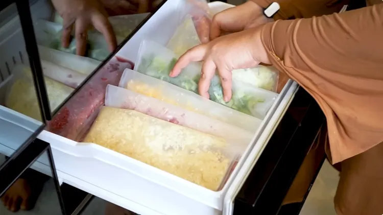 Di freezer ini juga Tasyi menyimpan food prep, seperti daun bawang iris, bawang putih cincang, dan jagung pipil yang sudah dimasukkan dalam plastik wrap agar lebih rapi dan bebas bau.