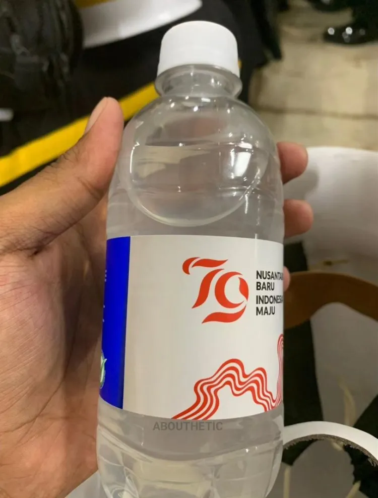 Untuk minuman yang pertama, ada minuman isotonik yang diberikan label khusus bertuliskan tema HUT RI Ke-79; 79 Nusantara Baru Indonesia Maju.