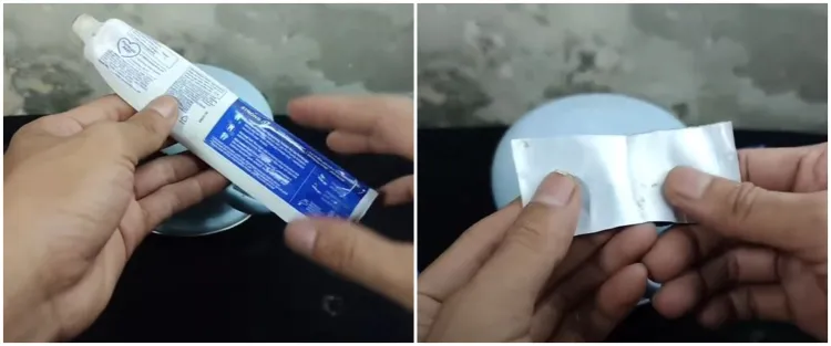 Pastikan ukuran tambal panci lebih besar dibanding lubang sumber kebocoran pada panci, ya. Setelah itu panaskan panci terlebih dahulu. Nyalakan api, panaskan sisi lubang yang bocor hingga benar-benar panas. Jika sudah panas langsung saja tempelkan bungkus pasta gigi ke lubang panci. Lalu tekan-tekan bungkus pasta gigi bekas dengan bantuan sendok.