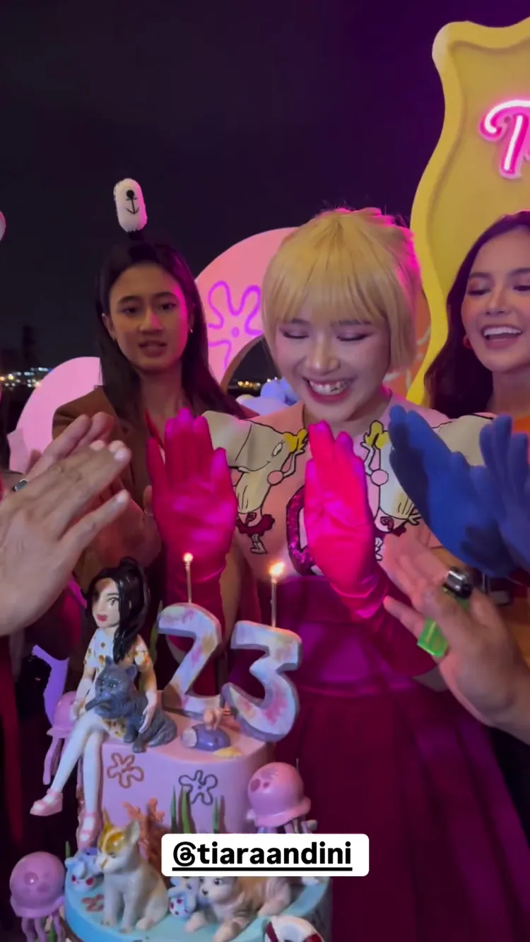 Tak hanya itu, Tiara Andini sendiri bahkan mengenakan kostum Pearl Krabs. Pelantun lagu Janji Setia tersebut mengenakan dress merah muda dan rambut palsu berwarna pirang demi mendalami karakter Pearl. Selain dekorasi dan kostum, kue ulang tahun Tiara Andini yang ke-23 ini juga dihias dengan karakter serupa.