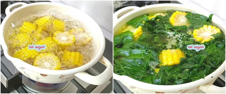 Jika sudah, rebus air di panci sampai mendidih, lalu masukkan jagung yang sudah dipotong-potong. Setelah matang, barulah kemudian masukkan daun katuk yang sudah dicuci bersih. Tekan-tekan dan tambahkan bumbu penyedap, seperti 1 sdt garam dan 1/2 sdt kaldu jamur.
