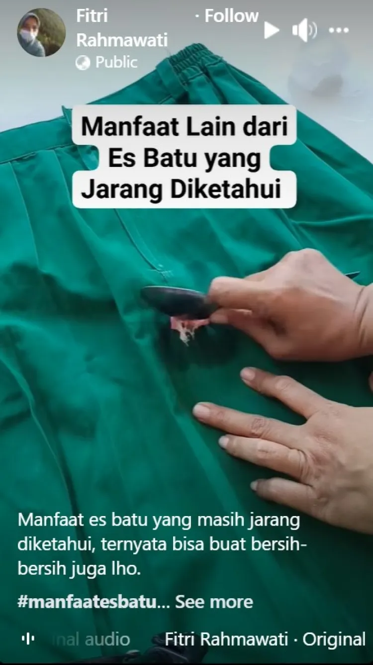 Sayangnya, penggunaan minyak goreng bisa menimbulkan bekas noda yang juga sulit dihilangkan. Sebagai gantinya, kamu bisa meniru trik yang dibagikan pengguna Facebook Fitri Rahmawati. Melalui salah satu video yang diunggahnya, dia mengaku hanya menggunakan satu bahan makanan untuk menghilangkan permen karet di pakaian tanpa bekas.