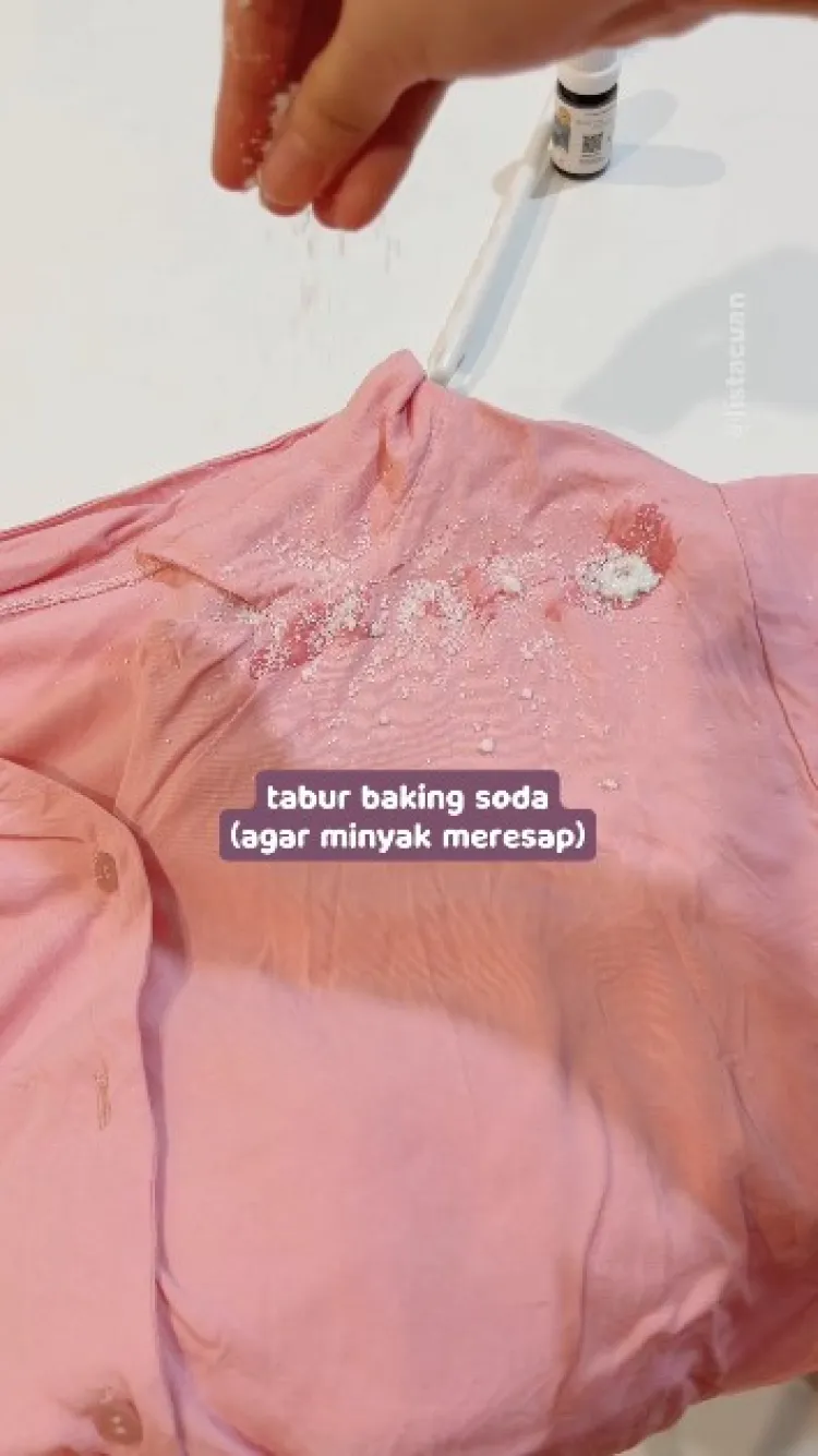 Pemilik akun TikTok @listacuan menjelaskan, baking soda ini akan mempercepat proses penyerapan noda minyak agar tak lagi menempel di baju.