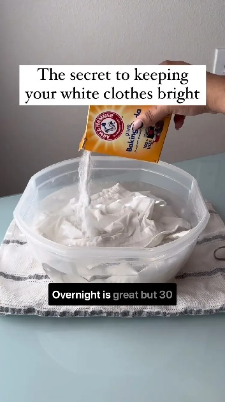 Sebelum masuk ke triknya, siapkan dulu ember atau baskom untuk merendam baju putih yang ingin dicuci. Tuangkan air panas ke dalamnya, baru rendam baju putihmu. Tak sampai situ saja, kamu juga wajib menambahkan baking soda secukupnya.