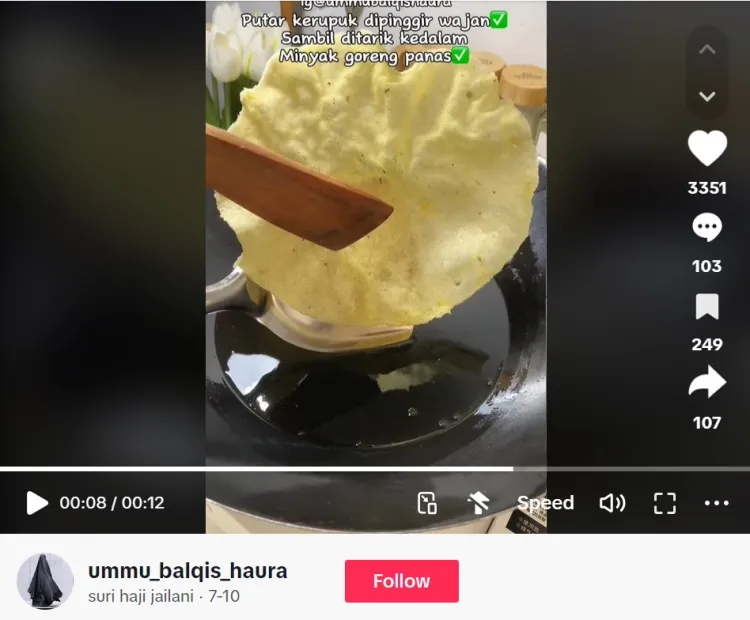 Dilansir BrilioFood dari TikTok @ummu_balqis_haura pada Rabu (31/7), teknik menggoreng yang dilakukan adalah dengan menggoreng kerupuk dari sisi samping. Jadi, dia tidak langsung mencelupkan kerupuk ke dalam minyak panas yang sudah disiapkan.