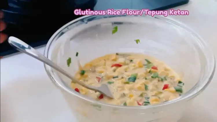 Aduk adonan sampai rata. Pastikan konsistensi adonan tidak terlalu encer ataupun terlalu kental. Jika adonan masih terlalu encer, kamu bisa menambahkan tepung ketan lagi secukupnya. Setelah itu, masukkan jagung yang sudah dipipil dan aduk lagi sampai rata.