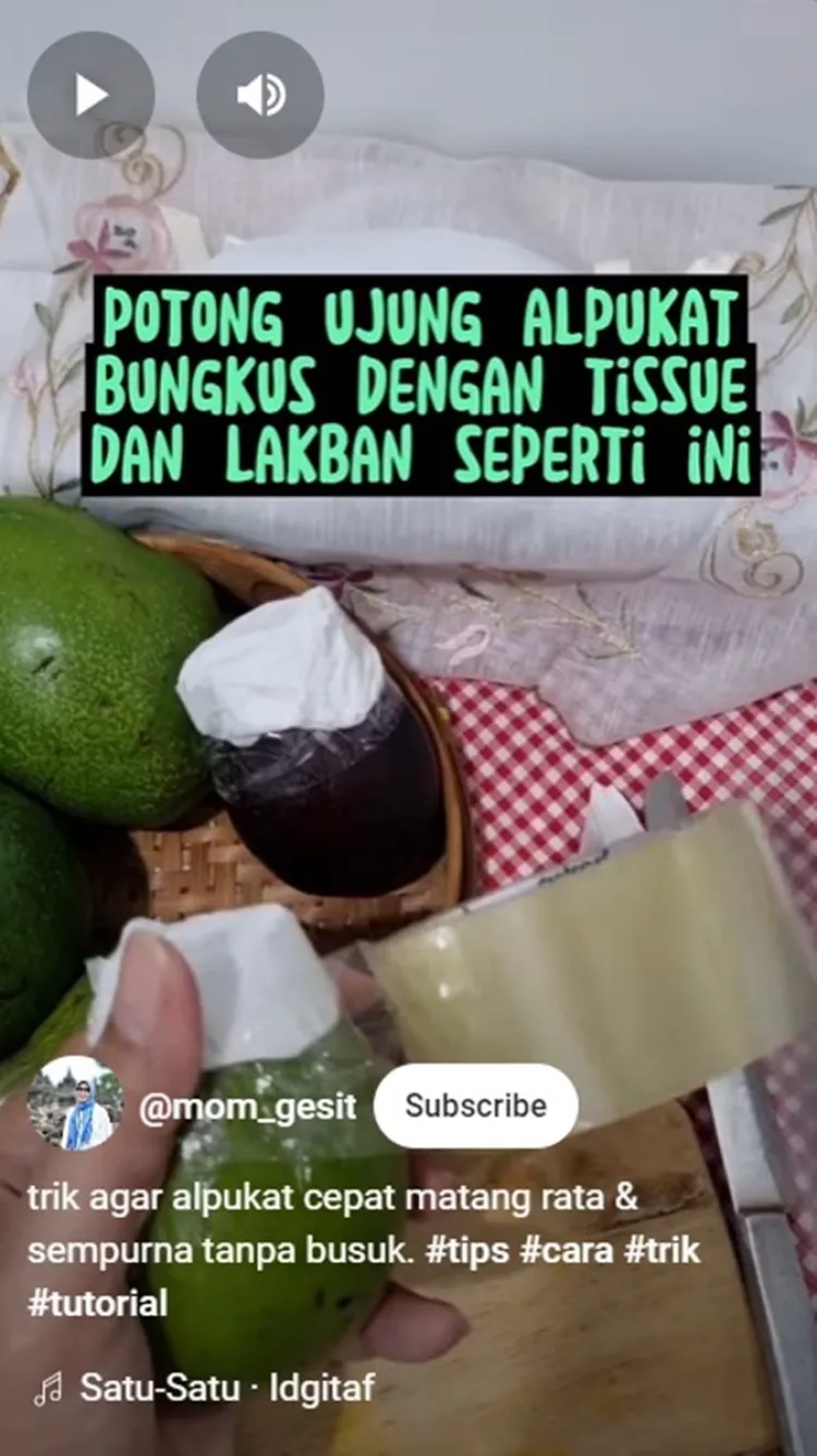 Dilansir BrilioFood dari YouTube tri rahayu pada Rabu (11/9), alat yang dimaksud adalah tisu dan lakban. Jadi, kedua alat ini akan digunakan untuk membungkus alpukat yang masih mentah. Setelah dibungkus, alpukat akan matang secara merata dan nggak mudah busuk.
