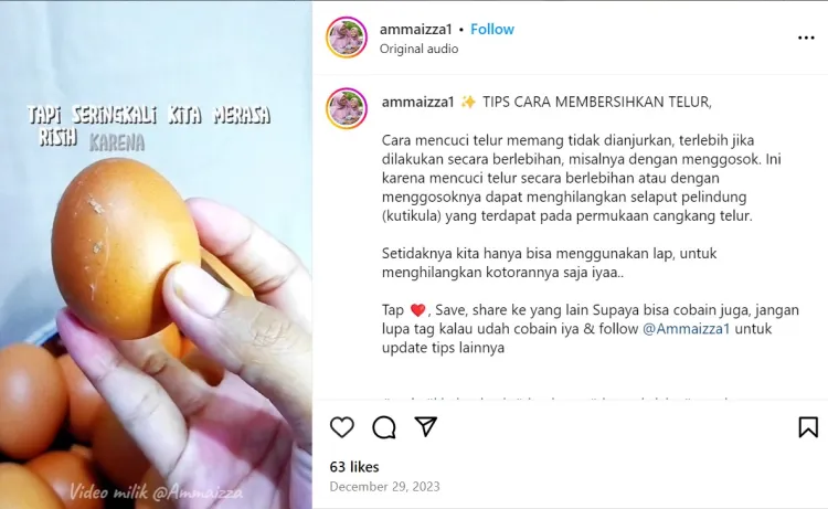 Namun tidak dapat dipungkiri bahwa sebagian orang kerap risih karena mendapati telur yang kotor. Oleh sebab itu, pengguna Instagram @ammaizza1 menggunakan cara aman yakni dengan mengelap cangkang telur menggunakan kain. Hal ini dinilai bisa mengangkat kotoran dan noda di permukaan cangkang telur.