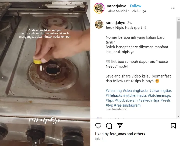 Sebagai gantinya, kamu bisa menerapkan trik yang dibagikan pengguna Instagram @ratnatjahyo. Melalui salah satu video unggahannya, pemilik akun tersebut mengaku tidak menggunakan sabun untuk membersihkan lemak membandel di kompor. Namun ada satu jenis buah yang lebih ampuh dalam mengangkat kotoran membandel.
