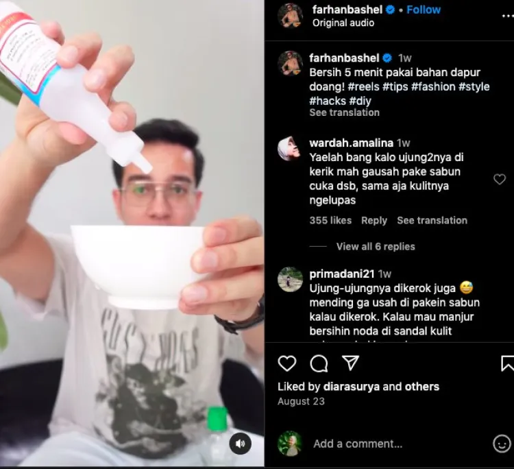 Seperti yang diperlihatkan pengguna akun Instagram @farhanbashel. Dalam salah satu unggahannya, pemilik akun yang akrab disapa Farhan tersebut menunjukkan cara membersihkan sandal dekilnya hanya mengandalkan bahan-bahan dapur saja. Hasilnya juga sesuai ekspektasi karena bersih maksimal seperti baru lagi.