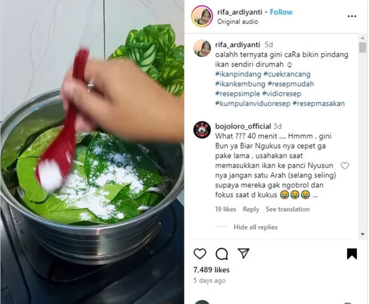 Dilansir BrilioFood dari Instagram @rifa_ardiyanti pada Sabtu (14/9), dia mengaku menggunakan satu jenis rempah daun untuk membuat ikan pindang, yakni daun salam. Nah, daun salam ini digunakan untuk menghilangkan bau amis saat ikan dimasak. Selain itu, daun salam juga digunakan untuk membungkus ikan, sehingga dagingnya tak mudah menempel dan hancur.
