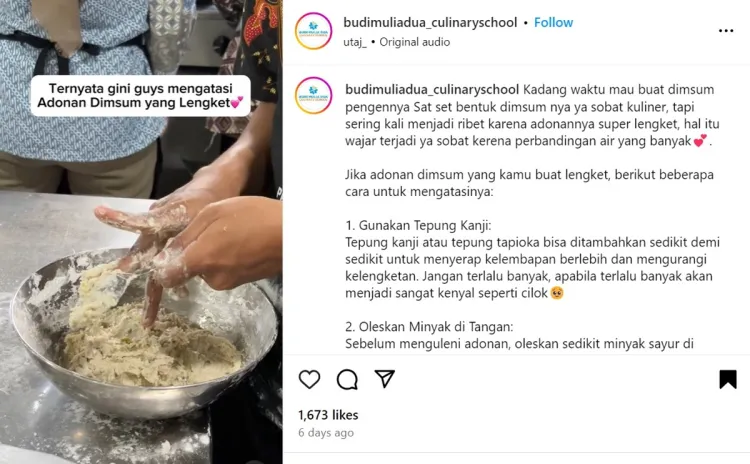 Namun jika adonan sudah terlalu lembek, kamu bisa menggunakan trik yang dibagikan pengguna Instagram @budimuliadua_culinaryschool. Melalui salah satu video yang diunggah, warganet tersebut mengaku menggunakan dua bahan tambahan supaya adonan dimsum tidak lengket dan bisa dicetak. Dilansir BrilioFood dari akun Instagram @budimuliadua_culinaryschool pada Kamis (5/9), bahan tambahan yang digunakan adalah tepung kanji atau tapioka dan air es.