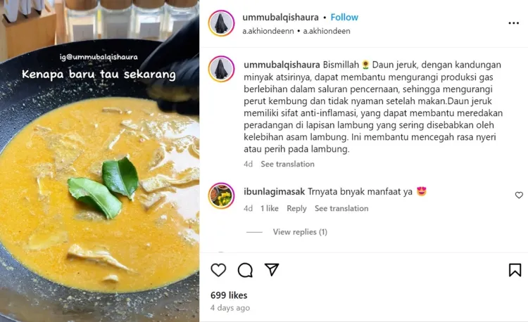 "Daun jeruk memiliki sifat anti-inflamasi, yang dapat membantu meredakan peradangan di lapisan lambung yang sering disebabkan oleh kelebihan asam lambung. Ini membantu mencegah rasa nyeri atau perih pada lambung," jelas pengguna Instagram @ummubalqishaura.