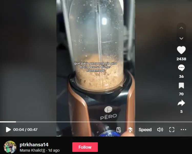 Hal ini juga diterapkan oleh pengguna akun TikTok @ptrkhansa14. Salah satu masakan yang sempat dibuat oleh emak-emak ini yakni selai kacang. Selai kacang homemade tersebut sengaja ia buat untuk dijadikan olesan roti pada MPASI anaknya yang usianya masih belum genap setahun.