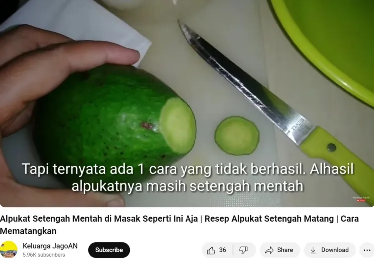 Yup, alpukat setengah matang yang gagal diperam ini sebenarnya bisa dimasak jadi makanan lezat. Pengguna YouTube tersebut bahkan mengaku hendak menumisnya dengan bumbu dapur. Tumis alpukat tersebut lantas dijadikan menu sayur sebagai pelengkap makan.