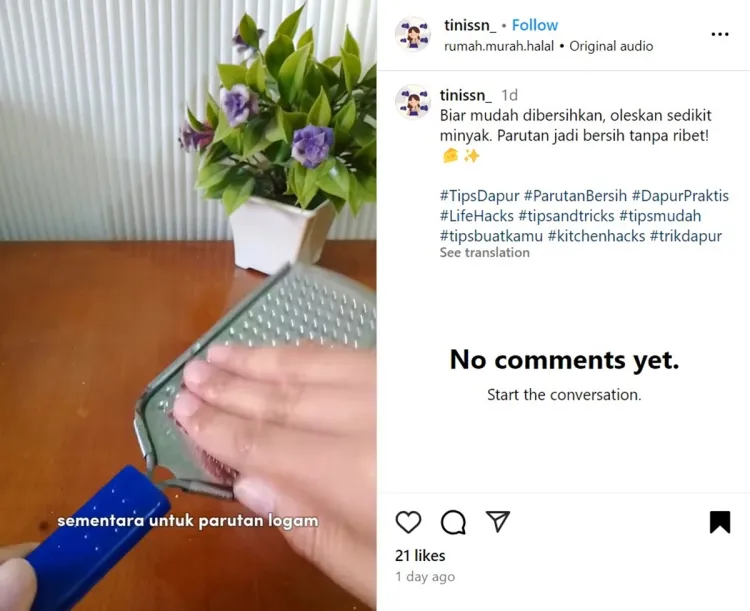 Melalui salah satu video yang diunggah, warganet tersebut mengaku punya trik sederhana untuk membersihkan parutan keju agar nodanya mudah luntur tanpa disikat. Dilansir BrilioFood dari Instagram @tinissn_ pada Jumat (6/9), trik tersebut melibatkan satu bahan dapur, yakni minyak goreng. Jadi, minyak goreng ini akan dipakai untuk membersihkan parutan keju.