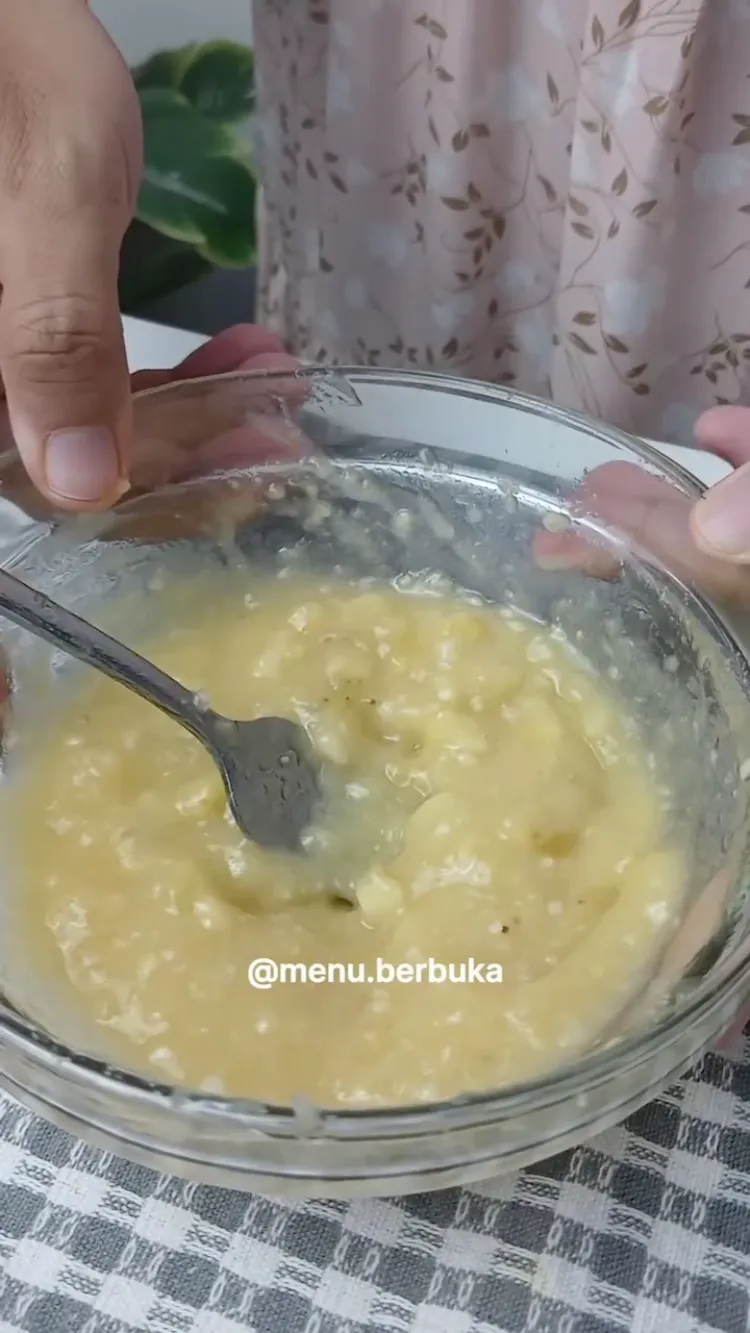 Jika sudah dilumatkan, diamkan dulu adonan pisang ini di suhu ruang atau chiller kulkas selama 15-30 menit. Hal ini penting dilakukan supaya pisang teroksidasi dan berubah warna jadi kecokelatan. Selain itu, pisang didiamkan terlebih dahulu agar lebih terlihat seratnya.