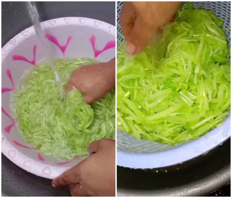 Langkah terakhir, buang airnya dan pindahkan labu siam ke saringan. Nah, sembari ditiriskan, bilas lagi labu siam dan remas-remas terus. Setelah diremas sesaat, tiriskan labu siam. Dengan begitu, labu siam siap diolah dengan berbagai macam bumbu.