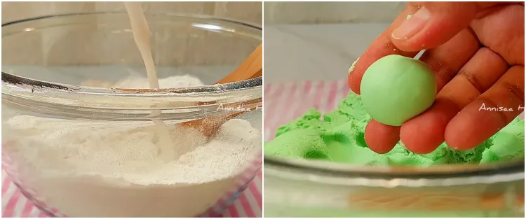 Selanjutnya, tambahkan 1 sdt pasta pandan ke sisa santan. Lalu tuang ke dalam adonan sampai habis. Aduk-aduk terus sampai adonannya kalis dan mudah digulung. Sebelum siap dicetak atau digulung, rebus air dalam panci dan tambahkan 1 lembar daun pandan.