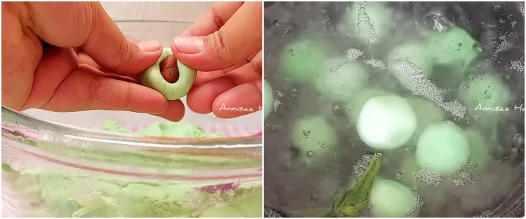"Setelah dibentuk, adonannya langsung masukkan ke dalam air mendidih dan jangan didiamkan di wadah yang terbuka. Kalau nggak langsung kita masukkan, gula merahnya akan bocor karena tekstur dari tepung ketan yang mleber," terang Annisaa.