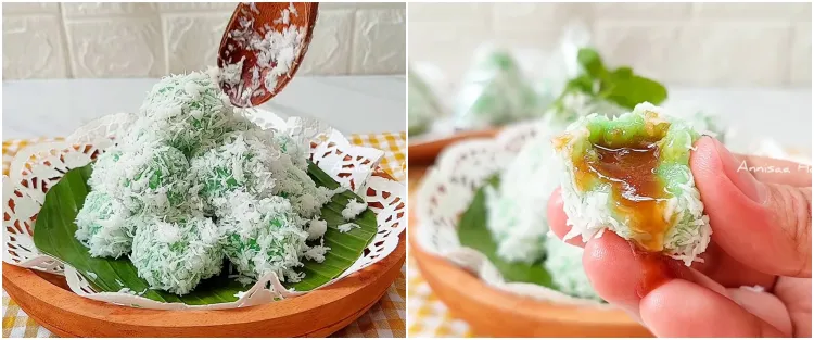 Bentuknya bulat kecil dengan warna hijau mencolok berasal dari daun pandan. Selain itu, bagian luar klepon juga kenyal, sementara bagian dalamnya berisi gula merah cair yang manis. Saat digigit, gula merah yang lembut meleleh di mulut, menciptakan sensasi rasa manis nan unik.