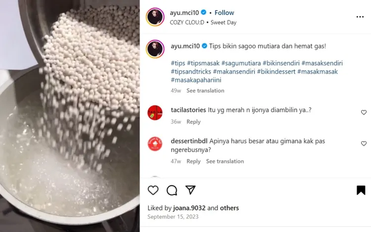 Demi mengatasi hal tersebut, kamu bisa meniru trik yang dibagikan Ayu Kandi melalui Instagram @ayu.mci10. Pada salah satu video yang diunggah, jebolan MasterChef musim ke-10 ini mengaku hanya membutuhkan waktu 12 menit untuk merebus sagu mutiara. Dengan durasi tersebut sagu mutiara yang dihasilkan bisa matang sempurna, kenyal, dan nggak lengket.