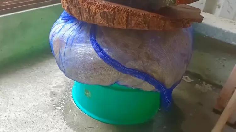 Kemudian fermentasi rebung. Caranya, letakkan rebung yang sudah dibungkus tadi di atas baskom yang terbalik. Lalu himpit menggunakan beberapa balok bata yang berat. Hal ini dilakukan untuk menekan sisa air yang ada di dalam rebung. Supaya hasilnya kian maksimal, fermentasi rebung selama 2 malam.