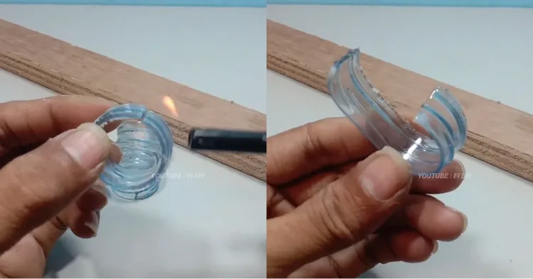 Usai dipotong, salah satu sisi potongan botol plastik tersebut harus diratakan. Cara meratakannya, panaskan salah satu sisi potongan botol plastik dengan api sampai lentur, baru tahan sampai bentuknya tak melengkung lagi.
