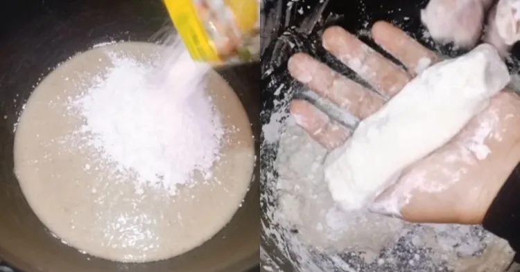 Campurkan bubur nasi dengan tepung tapioka secukupnya. Yup, olahan nasi sisa ini akan disulap jadi kerupuk, makanya harus diberi tepung tapioka. Aduk-aduk adonan kerupuk sampai tercampur rata. Kamu bisa menambahkan tepung tapioka lagi secara bertahap sambil diaduk. Lakukan penambahan tepung sampai adonan bisa dibentuk.