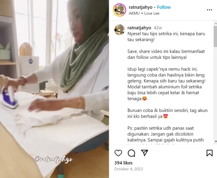 Dalam video tersebut, pengguna Instagram @ratnatjahyo menyetrika baju berbahan kaus yang memiliki sablon. Dalam sekali gosong, kain tersebut langsung licin dan lurus. Padahal yang disetrika hanya satu sisi saja, namun sisi kaus di baliknya juga ikut licin dan rapi, lho.