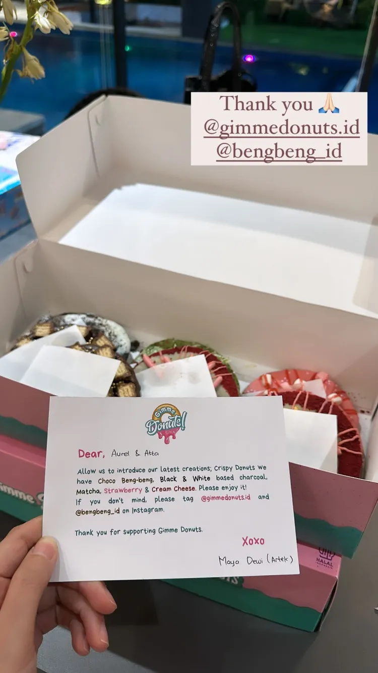 Nggak melulu dalam bentuk kue tart, Aurel Hermansyah juga mendapat kejutan donat dengan aneka rasa di hari ulang tahunnya ini.