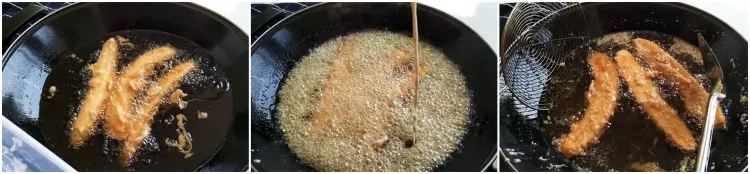 Selanjutnya, celupkan pisang yang sudah dibelah dua ke dalam adonan kental. Lalu masukkan pisang ini ke dalam wajan berisi minyak yang sudah dipanaskan. Goreng sampai pisang kering dan kaku, lalu balik.