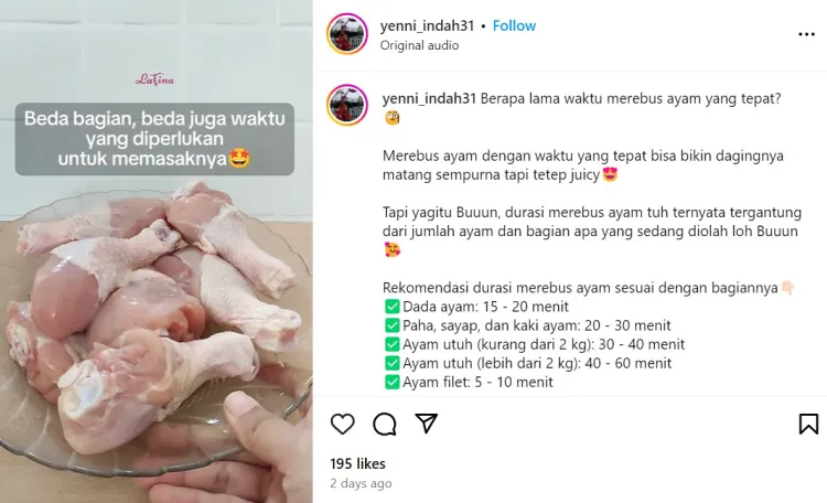 Dalam video tersebut, pengguna Instagram @yenni_indah31 juga memberikan trik saat hendak mengolah daging ayam utuh. Jika ayam utuh yang hendak dimasak memiliki bobot kurang dari 2 kg, maka kamu bisa memasak atau merebusnya selama 30-40 menit. Sedangkan ayam utuh dengan berat lebih dari 2 kg harus dimasak lebih lama, yakni 40-60 menit.