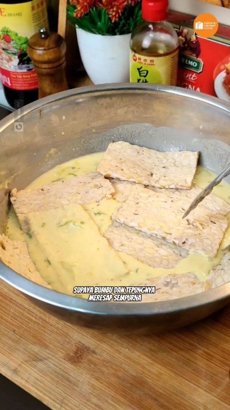 Saat adonan sudah siap, langsung celupkan semua potongan tempe yang ingin digoreng ke dalamnya. Pemilik akun TikTok @chefharitv juga menjelaskan, semakin tipis potongan tempenya, otomatis hasilnya akan semakin renyah pula. Bolak-balik agar adonannya bisa menyelimuti tempe secara keseluruhan.