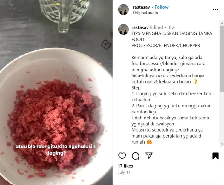 Pengguna Instagram @rastasav adalah salah satu orang yang menggunakan alat sederhana saat hendak menghaluskan daging sapi. Bukan dengan chopper, blender, atau mesin penggiling, dia justru memakai alat yang ada di dapur. Dilansir BrilioFood dari Instagram @rastasav pada Rabu (11/9), alat dapur yang dimaksud adalah parutan keju. Yup, warganet tersebut mengandalkan parutan keju untuk menghaluskan daging sapi agar hasilnya bisa lembut.