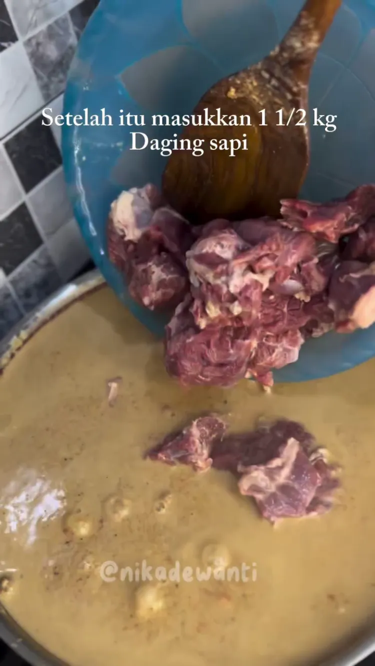 Selanjutnya, aduk-aduk semua bahan dan didihkan kembali selama 20-30 menit. Nah, di sinilah kuncinya. Bumbu yang dimasak dalam waktu lama bersama santan akan membuatnya matang dan lebih wangi meskipun tidak ditumis sebelumnya. Lantas jika santannya sudah mendidih lagi, masukkan 1,5 kg daging sapi yang sudah diiris. Aduk sesekali sampai mengental.