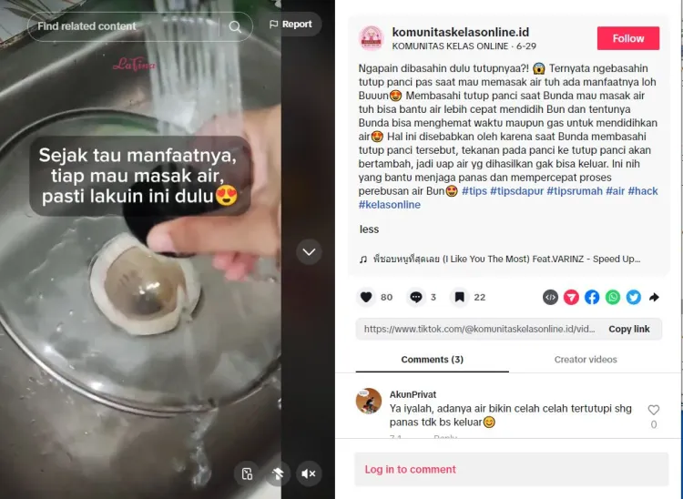 Tapi nggak melulu begitu, ternyata ada cara lain yang bisa dipraktikkan saat merebus air agar mendidih lebih cepat. Cara yang terbilang lebih praktis ini ditunjukkan oleh pengguna TikTok @komunitaskelasonline.id. Tampak dalam unggahan video, ia mengandalkan satu alat sederhana.