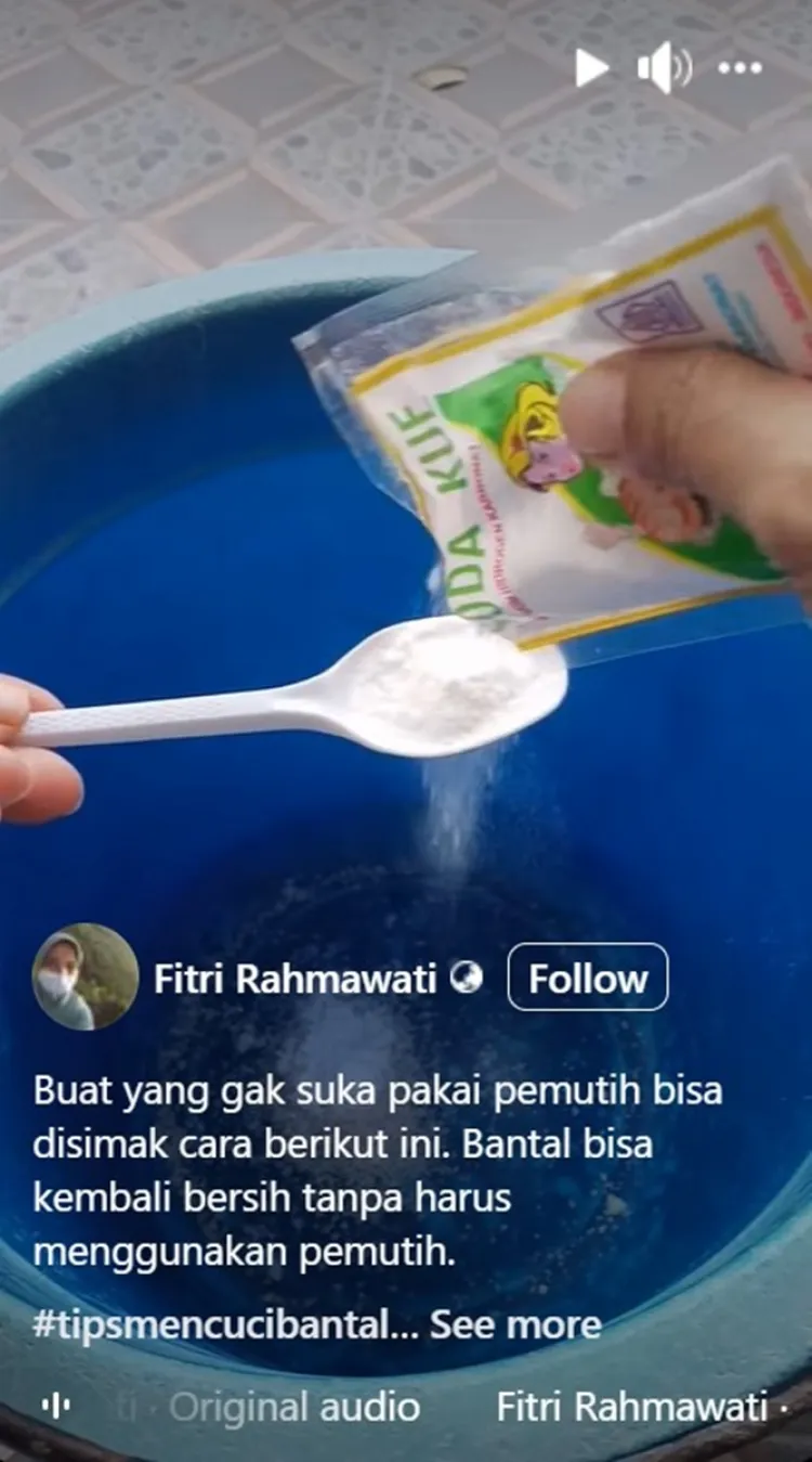 Beruntungnya, seorang pengguna Facebook Fitri Rahmawati pernah membagikan cara mencuci bantal dekil dan jamuran. Melalui salah satu video Reels yang diunggah, dia mengaku tidak menggunakan cairan pemutih yang keras. Namun pengguna Facebook tersebut justru mengandalkan tiga bahan sederhana yang ada di dapur.