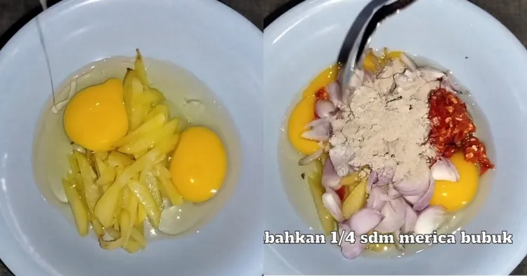 Usai digoreng, tiriskan dan sisihkan kentang di dalam mangkuk. Lalu, campurkan kentang dengan telur dan bumbu-bumbu. Pemilik akun YouTube alwaysgnia kali ini hanya menggunakan 2 butir telur, lho. Meski begitu, hasil telur dadarnya nanti akan tetap tebal karena ada tambahan kentang.