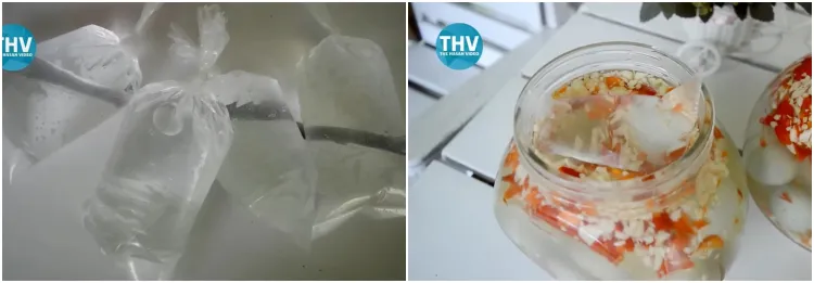 Supaya telur lebih terendam, siapkan beberapa bungkus plastik berisi air bersih. Lalu letakkan plastik ke dalam toples agar telur yang berada di bagian atas semakin terendam sempurna. Barulah kemudian tutup rapat dan diamkan 10 hari.