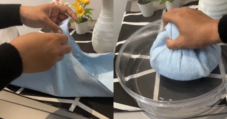 Selanjutnya, siapkan 1 handuk bersih dan tutup panci. Ikat handuk agar menutupi seluruh bagian bawah tutup panci, kemudian celupkan ke racikan air panas dan sabun cuci piring.