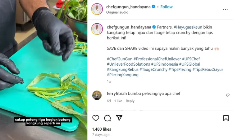 Di sisi lain, merebus kangkung dan tauge dalam waktu lama akan membuat teksturnya jadi lembek. Selain itu, warnanya juga berubah gelap. Sebagai gantinya, kamu bisa meniru trik yang dibagikan oleh pengguna Instagram @chefgungun_handayana. Melalui salah satu video yang diunggah, chef sekaligus content creator ini mengaku hanya menggunakan trik khusus untuk merebus kangkung dan memasak tauge untuk plecing.