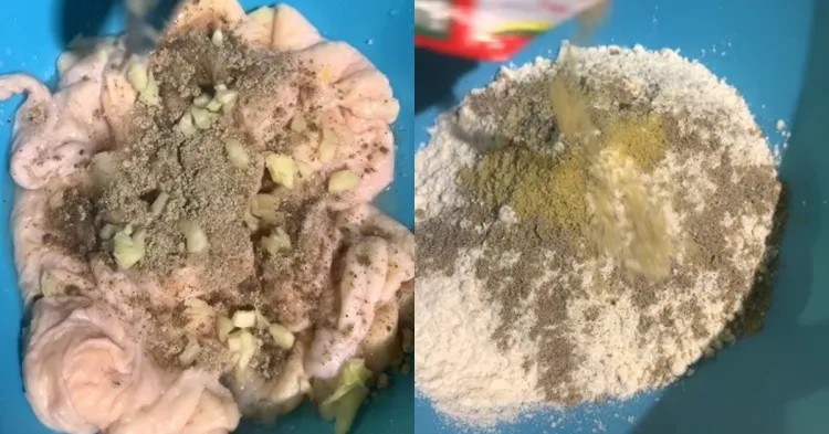 Selagi menunggu kulit ayam dimarinasi, kamu bisa menyiapkan adonannya. Campurkan tepung terigu protein tinggi, lada, dan penyedap rasa di dalam wadah
