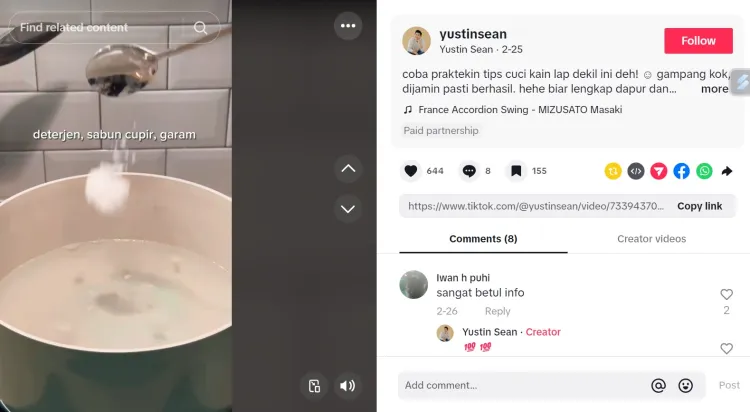 Sebagai solusi, ada beberapa cara efektif untuk membersihkan kain lap yang sudah dekil dan mengembalikannya ke kondisi layak pakai. Salah satu metodenya pernah ilakukan pengguna TikTok @yustinsean. Melalui salah satu video yang diunggah, dia mengaku memiliki trik praktis untuk mencuci kain lap berminyak supaya lebih kesat dan bebas bau apek.