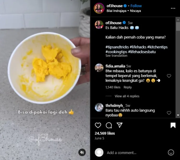 Mengintip unggahan milik Instagram @of3house yang sudah mendapat 743 ribu viewers, tak sedikit warganet meninggalkan komentar antusias, lho. Beberapa dari warganet mengaku sangat terbantu dengan trik memadatkan margarin cair ini.